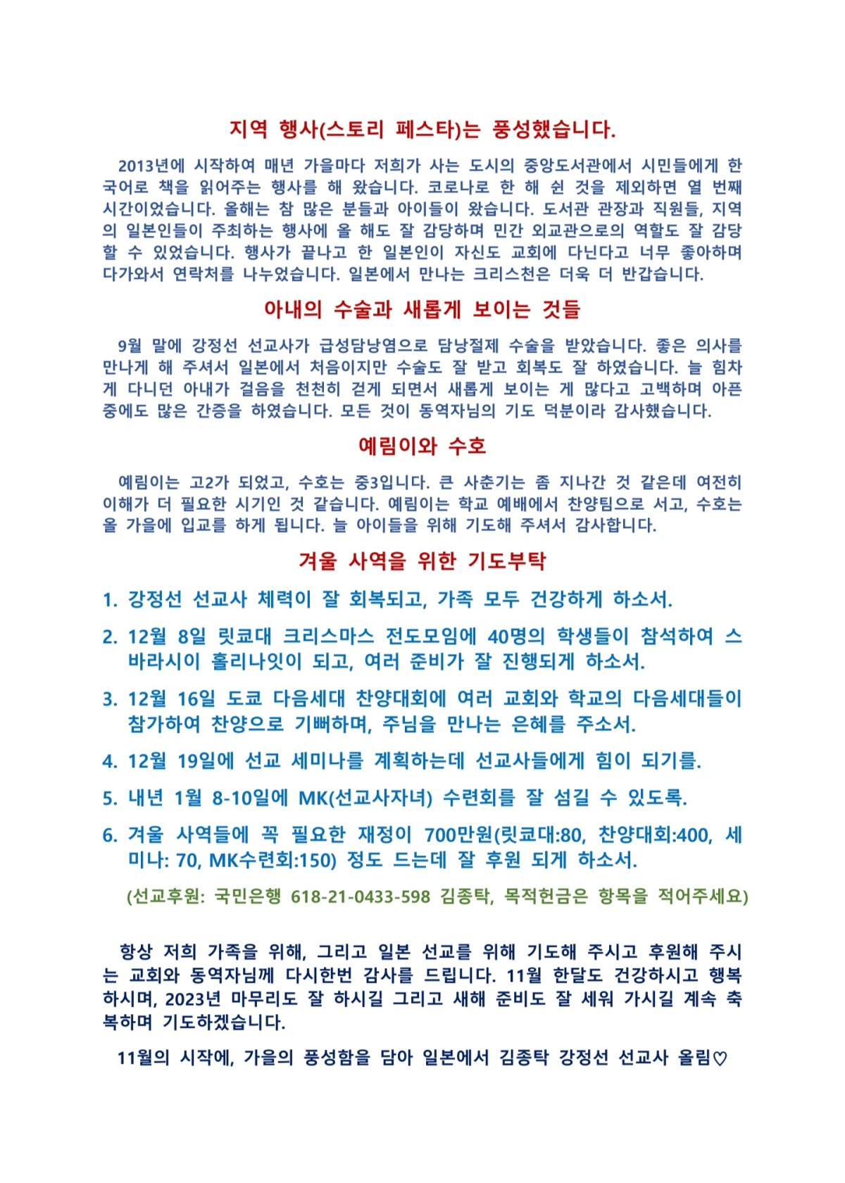 페루 (김태식 김명화 선교사) 12월 사역 소식
